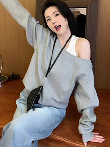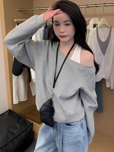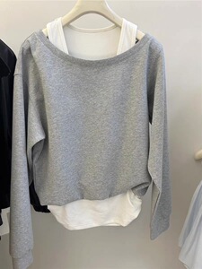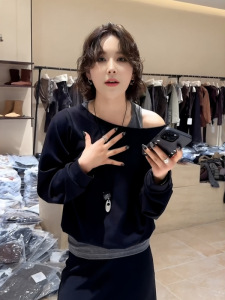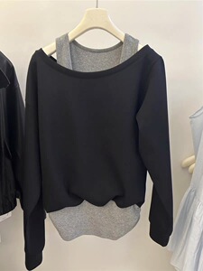 大码女装黑色假两件斜肩上衣胖mm宽松显瘦长袖卫衣t恤直播爆款