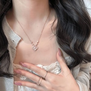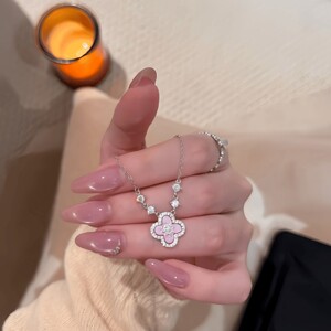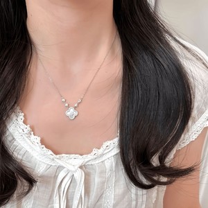 S925纯银粉贝白贝母点钻四叶草项链轻奢小众高级百搭气质复古首饰