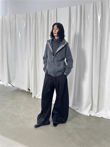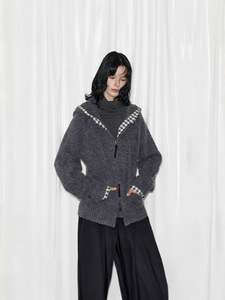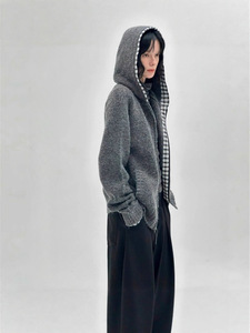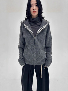 灰色双拉链针织开衫拼接格纹连帽毛衣外套男女秋冬季慵懒宽松上衣