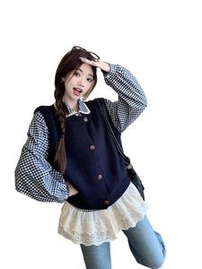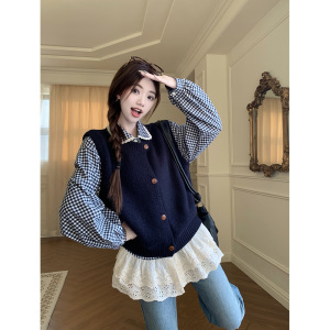 韩系格子蕾丝花边长袖衬衣针织马甲背心女2025秋季新款时尚两件套