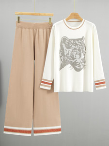 2025年秋冬新款跨境时尚烫钻豹头针织套装女时尚宽松毛衣两件套潮
