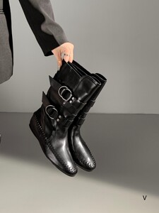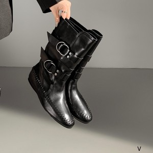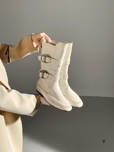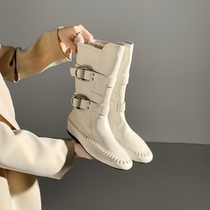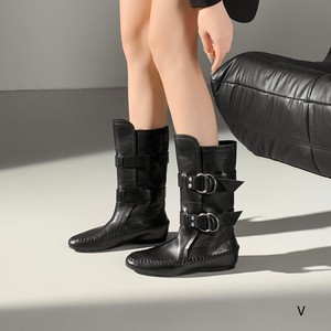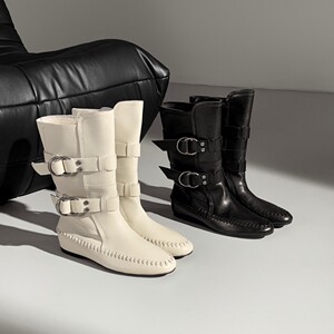 欧洲站女鞋25秋冬时尚皮带扣软头层牛皮圆头平底舒适中低套筒短靴