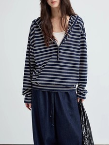 JUSLIN 轻运动连帽排扣下摆自然微堆 宽松落肩长袖条纹上衣 L0715