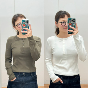 2025秋冬新款女士罗纹亨利领T恤长袖单排扣修身显瘦打底衫479591