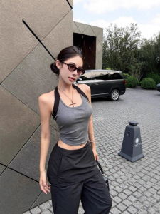 梦优莱韩系辣妹风撞色U领挂脖拼接背心吊带女夏新款修身显瘦上衣