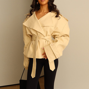 欧美跨境女装2025秋冬新款时尚翻领纯色配腰带修身短款风衣外套