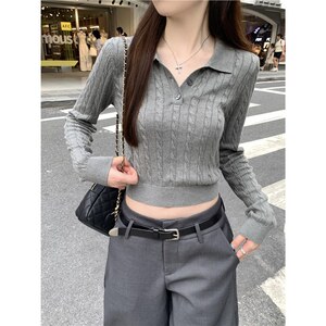 现货实拍秋季韩版polo领针织衫6羊毛灰色麻花毛衣女长袖打底衫