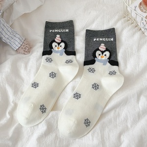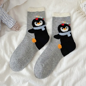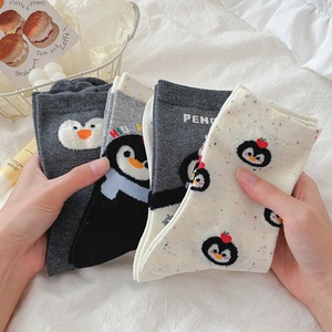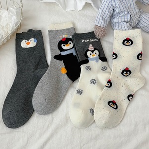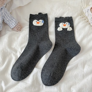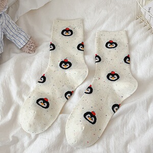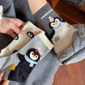 秋冬无骨韩国风袜子休闲可爱卡通小企鹅格雷灰色精梳棉中筒学生