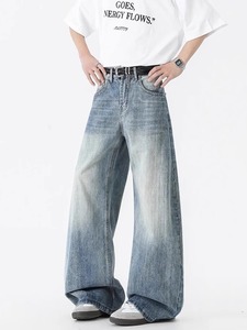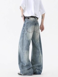 美式水洗竹节纹弯刀牛仔裤男新款休闲宽松复古潮牌直筒阔腿长裤子