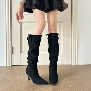洋气百搭尖头细跟显瘦长靴女堆堆靴皮带扣褶皱高跟长筒靴瘦瘦靴秋