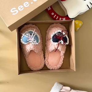 可爱蝴蝶结爱心毛毛拖鞋女外穿2025秋冬季居家防滑保暖一字棉拖鞋