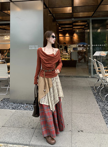 旅游穿搭套装女 挂脖一字肩长袖T恤早秋季假两件格子半身裙两件套