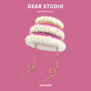 拼色辫子仿兔毛针织帽 粉绿条纹