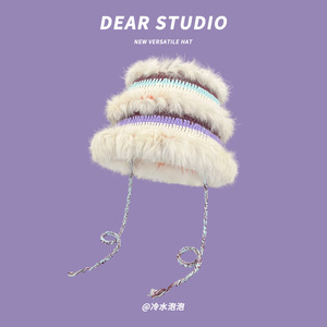 拼色辫子仿兔毛针织帽 蓝紫条纹