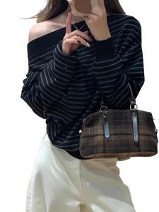 韩系纯欲风斜肩条纹长袖针织衫女春秋2025新款感时尚百搭上衣