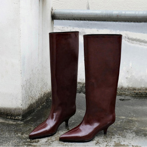 初秋气质尖头小高跟不过膝长筒靴宽筒大筒围西部靴女式靴子