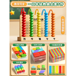 【一二年级教具全套6件】5档计数器+16粒几何体+几何片+方形棒+圆片+七巧板