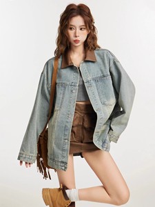 复古水洗翻领拼接牛仔外套女春秋款秋冬季小个子正肩工装夹克上衣
