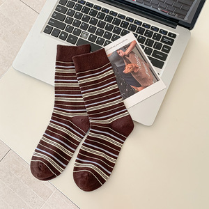 复古风秋冬miu系风布标麻花堆堆袜棉袜无骨条纹撞色中筒女袜子