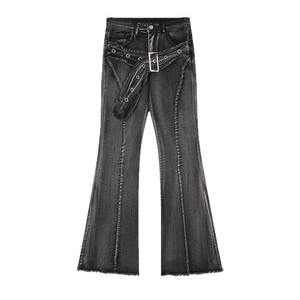 高街黑色微喇牛仔裤女复古设计感腰带修身显瘦直筒拖地马蹄裤子