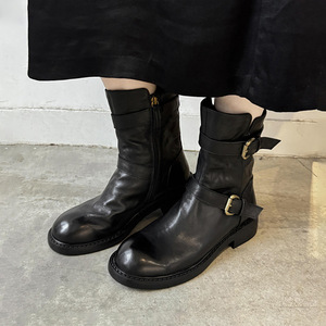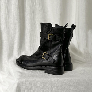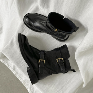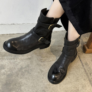羊皮版~英伦风皮带扣真皮马丁靴女新款复古圆头粗跟百搭显瘦短靴