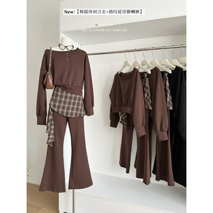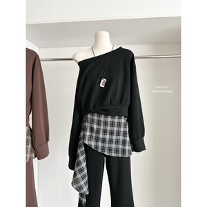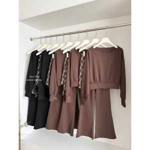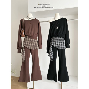 秋十三行斜肩领长袖卫衣+小众设计感格子围裙拼接修身女长裤套装