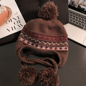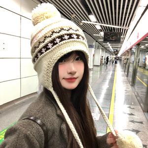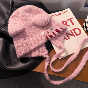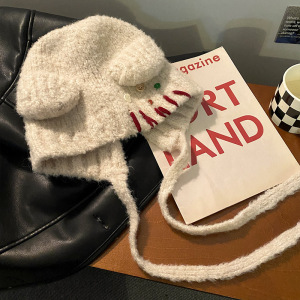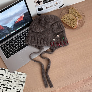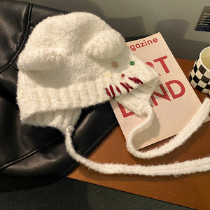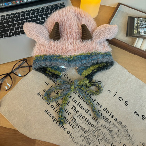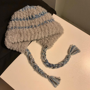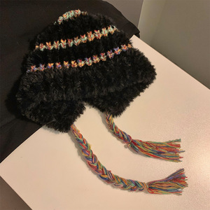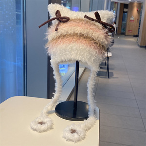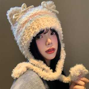 蝴蝶结猫耳朵毛绒帽女秋冬季条纹护耳针织帽显脸小保暖毛线帽子
