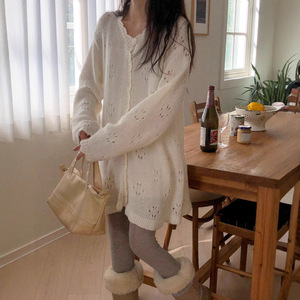 韩国chic秋季甜系少女云朵边宽松百搭中长款镂空花朵针织连衣裙