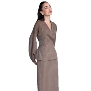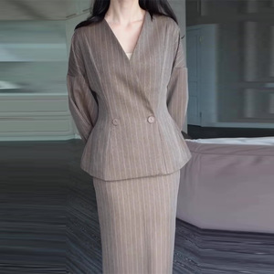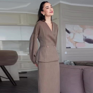 2025秋季新款欧美亚马逊跨境外贸女装v领收腰条纹时尚长裙两件套