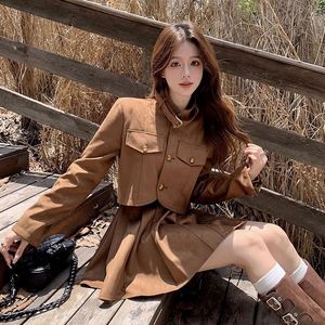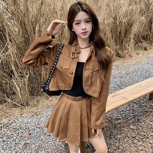 美式复古美拉德棕色夹克开衫短款外套百褶半身裙秋冬美拉德套装