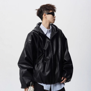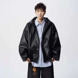 高级感机车皮夹克男春秋美式街头短款PU皮衣服潮牌复古连帽外套