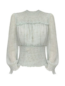 韩系气质绿色圆领防晒长袖衬衫女秋季收腰显瘦简约百搭雪纺衫上衣