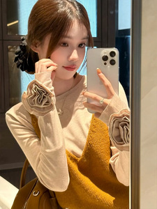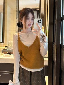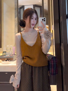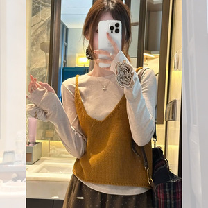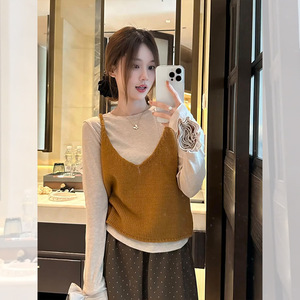 初秋外搭针织v领无袖马甲背心叠穿两件套小香风长袖t恤上衣女春秋