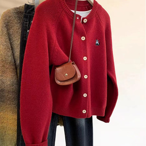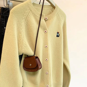 黄色刺绣圆领毛衣外套女秋冬2025新款欧货小个子时尚针织开衫