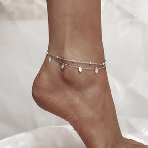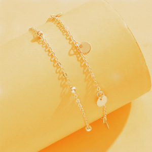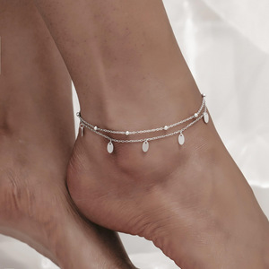 欧美跨境饰品 时尚沙滩圆珠圆片吊坠脚链 简约百搭铜珠链双层脚饰