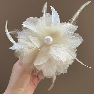 米黄色网纱花朵珍珠羽毛抓夹-12.5cm
