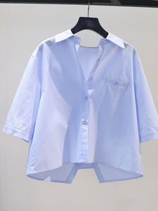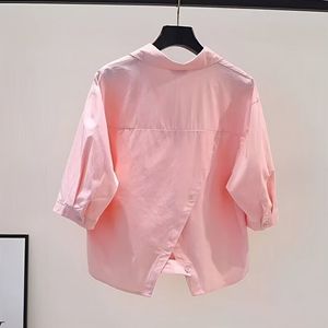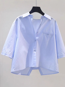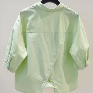 绿色休闲衬衫女夏季小个子上衣polo领五分袖短款后背开叉显瘦衬衣