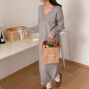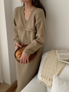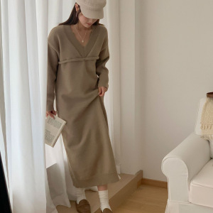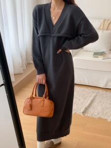 假两件针织连衣裙女2025秋冬法式v领收腰长款毛衣裙内搭打底裙厚