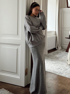 早秋慵懒风针织灰色两件套圆领宽松长袖上衣+包臀鱼尾长款半裙女