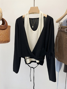 韩版2025秋冬季新款女装毛衣挂脖针织衫显瘦交叉绑带假两件上衣女