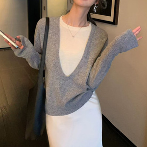 设计感假两件大U领100羊毛显瘦针织衫女春秋宽松毛衣
