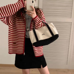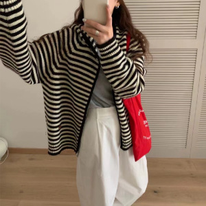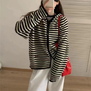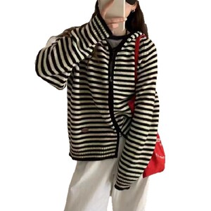 韩系条纹连帽双拉链针织开衫女秋冬新款撞色宽松外穿慵懒毛衣外套