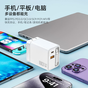 80W氮化镓充电器自带伸缩线a+c双口充电头全协议适用PD苹果快充头