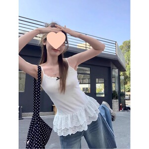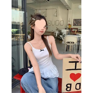 白色蝴蝶结吊带背心女早春夏季蕾丝花边下摆修身叠穿内搭打底上衣
