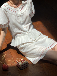 浮生八记“侯麦的夏天”法式复古重工刺绣泡泡袖衬衫A字半裙套装