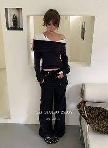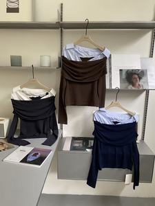 CXI 小众芭蕾风衬衫半开领露肩长袖叠穿露肩斜肩假两件上衣针织衫