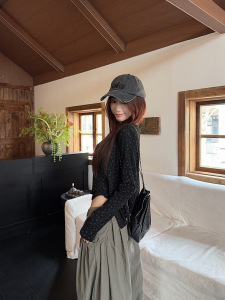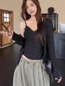 甜美套装复古碎花吊带背心女装早秋季叠穿显瘦黑色开衫外套两件套