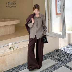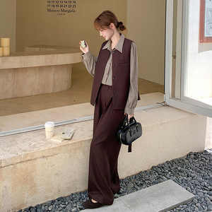 咖色复古高级感系带收腰马甲套装女2025秋季气质衬衫阔腿裤三件套