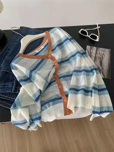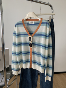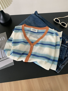 复古显白撞色V领针织薄外套初秋垂感百搭韩系蓝白条纹冰丝开衫女