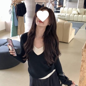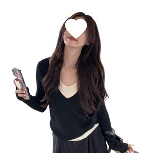 设计感V领假两件拼接针织毛衣女装2025早秋新款修身显瘦休闲上衣